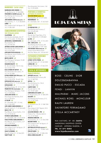 CABELEIREIROS & ESTÉTICA hair & beauty salons 244AVENIDA 4D Avenida da Liberdade, 244-2º Tel. 21 314 4360 · 92 782 4560 ANTON BEILL HAIRDRESSING 2D Rua Castilho, 57 Tel. 210 990 399 ANTÓNIA XAVIER CABELEIREIRO 2E Rua Rodrigo da Fonseca, 26 Tel. 21 314 3687 AYER INSTITUTO DE BELEZA 5F Rua Manuel Jesus Coelho, 4-3º Tel. 21 354 1529 BRITO & BRITO 4E Rua Rodrigues Sampaio, 94 AB Tel. 21 357 2944 EDUARDO BEAUTÉ 5G Av. da Liberdade, 166 r/c esq. Tel. 21 346 7190 ÉLIA LÉ MAKE UP ARTIST 3D Rua Alexandre Herculano, 19 Tel. 96 162 3881 ELVIRA GUEDES DAY SPA (CASTIL) 2D Rua Castilho, 39 Tel. 21 353 3278 · 96 445 1366 ESPELHO DE LUZ (HOTEL ALTIS) 3F Rua Castilho, 11 · T. 21 310 6000 ESPELHO MEU 2F Rua Rosa Araújo, 59 · 21 314 7815 FRANCISCO SÁ ATELIER CABELOS 4D Rua Rodrigues Sampaio, 112 B Tel. 21 353 8484 JEAN LOUIS DAVID 3D Rua Duque de Palmela, 30 A Tel. 21 352 8101 LE SALON 4D Av. Liberdade, 262 - r/c esq. Tel. 21 356 2057 LUÍS LEMOS CABELEIREIROS 4G Rua do Salitre, 5 · T. 21 346 6635 NAILS 4’US 5F Rua Manuel Jesus Coelho, 12 A Tel. 93 753 82 65 PATRICK CABELEIREIRO 3D Av. Liberdade, 245 · 21 315 0578 PAULO VIEIRA CABELEIREIROS 5F Rua Manuel Jesus Coelho, 4-2º Tel. 21 352 0516 PRESENÇA MARQUÊS 2C Rua Joaquim Antº de Aguiar, 29 Tel. 21 386 7119 SCALP & FRIENDS 6G Rua do Telhal, 31 · 21 346 2221 VANITY HAIR 3D
