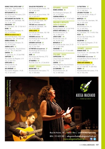 SOLAR DOS PRESUNTOS 6H Rua Portas de Santo Antão, 150 Tel. 21 342 4253 SOLMAR 6I Rua Portas de Santo Antão, 108 Tel. 21 342 3371 TERRAÇO (HOTEL TIVOLI LISBOA) 4F Avenida da Liberdade, 185 Tel. 21 319 8934 THE BAR (HOTEL FONTECRUZ) 5G Avenida da Liberdade, 138 Tel. 21 041 0000 TIVOLI CAFFÉ 5F Avenida da Liberdade, 182-188 Tel. 21 073 7240 VARANDA (HOTEL RITZ) 1B Rua Rodrigo da Fonseca, 88 Tel. 21 381 1400 VARANDA CASTILHO 3F Rua Castilho, 14 C - 7º Tel. 21 314 1045 CS VINTAGE RESTAURANTE BAR 2F Rua Rodrigo da Fonseca, 2 Tel. 210 405 400 XENÚ 3D Rua Duque de Palmela, 27 D Tel. 21 357 8406 ZÉ VARUNCA 6H Rua São José, 54 · 21 346 8018