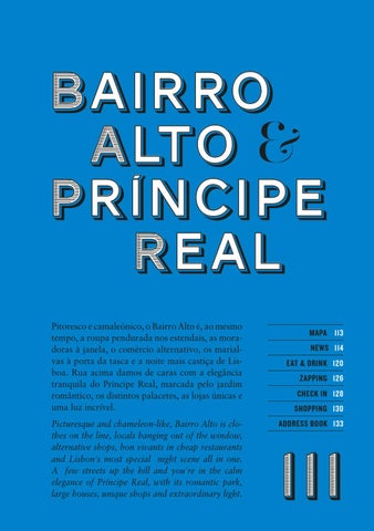 B BAIRRO A ALTO & P PRÍNCIPE R REAL Pitoresco e camaleónico, o Bairro Alto é, ao mesmo tempo, a roupa pendurada nos estendais, as moradoras à janela, o comércio alternativo, os marialvas à porta da tasca e a noite mais castiça de Lisboa. Rua acima damos de caras com a elegância tranquila do Príncipe Real, marcada pelo jardim romântico, os distintos palacetes, as lojas únicas e uma luz incrível. Picturesque and chameleon-like, Bairro Alto is clothes on the line, locals hanging out of the window, alternative shops, bon vivants in cheap restaurants and Lisbon's most special night scene all in one. A few streets up the hill and you're in the calm elegance of Príncipe Real, with its romantic park, large houses, unique shops and extraordinary light.