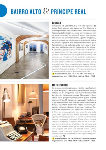 Há pessoas com olho para o que é bonito, o que fica bem e o que tem graça. A Retrostore, recentemente inaugurada na rua dos antiquários, é um manifesto irreverente às colecções mais conservadoras. São caçadores ferozes de peças que pertençam ao período que se estende dos anos 50 aos 90. E depois, é o que couber na oficina e o que a sensibilidade ditar. Ora restauram, ora alteram a função, ora pintam de amarelo. Mesas, candeeiros, capacetes militares, máquinas de escrever, cadeirões. Potencializar o melhor de cada objecto é o seu mantra. 3 There are some people who have an eye for what looks good, feels right and just works. Retrostore, recently opened in the antiques street, is an irreverent manifesto to more conservative collections. They are fierce hunters of pieces that belong to a period from the 50s to the 90s. And then it depends on what fits in the workshop and what sense dictates: some get restored, others given a new purpose and some are painted yellow. Tables, lamps, military helmets, typewriters, armchairs. The mantra is to bring out the best in each object. We recommend a visit! PS 2F Rua de São Bento, 230 · Tel. 21 590 0317 · www.retrostore.pt seg a sex / mon to fri 10h30 - 19h30 · sáb / sat 10h30 - 13h30