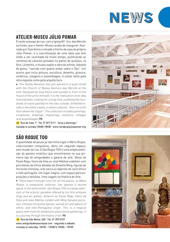 A quantidade de peças já não tinha lugar e Mário Roque, coleccionador compulsivo, abriu um segundo espaço, sem mudar de rua. A São Roque TOO é uma ampla extensão do paraíso ecléctico que encontramos na sua primeira loja de antiguidades e galeria de arte. Obras de Paula Rego, Vieira da Silva ou José Malhoa coabitam com porcelanas da China datadas da Dinastia Ming, figuras de terracota chinesas, arte sacra ou objectos de cariz étnico e indo-português. Um lugar mágico, com espaço para exposições e tertúlias. Uma viagem na História de Arte. 3 There wasn't enough room for all the pieces, so Mário Roque, a compulsive collector, has opened a second space in the same street. São Roque TOO is a large extension of the eclectic paradise offered by his first antiques shop and art gallery. Artwork by Paula Rego, Vieira da Silva and José Malhoa cohabit with Ming Dynasty porcelain, Chinese terracotta figures, sacred art and objects of ethnic and Indo-Portuguese origin. This is a magical place, with room for exhibitions and cultural gatherings. It is a journey through the history of art. PS 1D Rua de São Bento, 269 · Tel. 21 397 0197 www.antiguidadessaoroque.com · segunda a sábado monday to saturday 10h30 - 13h00 & 15h00 - 19h30