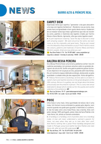 Expressão latina que significa “aproveitar o dia para descobrir uma loja com tapetes fantásticos”. Rendemo-nos ao nome, mas ainda mais à originalidade e bom gosto desta marca. Acabaram de se instalar nesta loja linda e garantimos que não vai resistir às cores, padrões e materiais dos tapetes criados por Carmo Mexia e Nuno Benito. Aproveite, olhe que estes tapetes voam! 3 A Latin expression meaning “seize the day to discover a shop with amazing carpets”. We were struck by the name, but even more so by the originality and good taste. They've just moved into this beautiful shop and believe us you'll find it hard to resist the colours, patterns and materials of Carmo Mexia and Nuno Benito's carpets. Grab one now while you can! 7C Rua Dom Pedro V, 74 · Tel. 93 557 4869 · www.carpetdiem.pt segunda a sábado / monday to saturday 10h00 - 20h30
