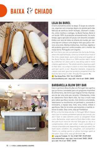 A Serra da Estrela avista-se daqui. É lá que as costureiras, algumas sem emprego depois de grande parte das fábricas de lanifícios terem fechado, retomam o trabalho, entre risinhos e cantigas, na Burel Factory. Burel é um tecido 100% lã produzido artesanalmente, há muito tempo, agora aplicado em peças com desenho inovador. Estão a ser alvo de todos os olhares do mundo, por isso uma loja em Lisboa é uma alegria mais que justa e merece uma visita. Mantas lindíssimas, mochilas, tapetes e até produtos gourmet confeccionados com o melhor da nossa Serra. Português com orgulho. 3 From here, you can just glimpse the Serra da Estrela, where the seamstresses, some out of work since most of the mills closed down, work amid song and laughter at the Burel Factory. Burel is a 100% woollen fabric made by craftsmen for years and is now being used in more creative applications. The whole world is beating a path to their door, so a shop in Lisbon is more than deserved and well worth a visit. Beautiful blankets, knapsacks, carpets and even gourmet products prepared from the best the Serra has to offer. Proudly Portuguese. PS 6D Rua Serpa Pinto, 15 B · Tel. 21 245 6910 www.burelfactory.com · seg a sáb / mon to sat 10h00 - 20h00