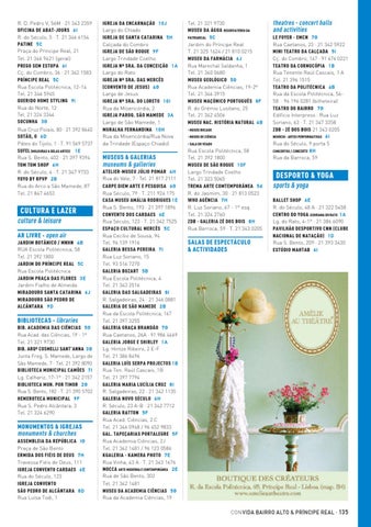 ATELIER-MUSEU JÚLIO POMAR 4 H Rua do Vale, 7 · Tel. 21 817 2111 CARPE DIEM ARTE E PESQUISA 6 G Rua Século, 79 · T. 211 924 175 CASA MUSEU AMÁLIA RODRIGUES 1E Rua S. Bento, 193 · 21 397 1896 CONVENTO DOS CARDAES 6 E Rua Século, 123 · T. 21 342 7525 ESPAÇO CULTURAL MERCÊS 5 C Rua Cecílio de Sousa, 94 Tel. 96 139 1916 GALERIA BESSA PEREIRA 7 I Rua Luz Soriano, 15 Tel. 93 516 7270 GALERIA BOZART 5 B Rua Escola Politécnica, 4 Tel. 21 343 2516 GALERIA DAS SALGADEIRAS 8 I R. Salgadeiras, 24 · 21 346 0881 GALERIA DE SÃO MAMEDE 2 B Rua da Escola Politécnica, 167 Tel. 21 397 3255 GALERIA GRAÇA BRANDÃO 7 G Rua Caetanos, 26A · 91 986 4469 GALERIA JORGE E SHIRLEY 1 A Lg. Hintze Ribeiro, 2 E-F Tel. 21 386 8496 GALERIA LUÍS SERPA PROJECTOS 1B Rua Ten. Raúl Cascais, 1B Tel. 21 397 7794 GALERIA MARIA LUCÍLIA CRUZ 8 I R. Salgadeiras, 22 · 21 342 1135 GALERIA NOVO SÉCULO 6 H R. Século, 23 A-B · 21 342 7712 GALERIA RATTON 5 F Rua Acad. Ciências, 2 C Tel. 21 346 0948 / 96 452 9833 GAL. TAPEÇARIAS PORTALEGRE 5 F Rua Academia Ciências, 2J Tel. 21 342 1481 / 96 123 0586 KGALERIA - KAMERA PHOTO 7 E Rua Vinha, 43 A · T. 21 343 1676 MOCCA ARTE MODERNA E CONTEMPORÂNEA 2 E Rua de São Bento, 302 Tel. 21 342 1481 MUSEU DA ACADEMIA CIÊNCIAS 5 G Rua da Academia Ciências, 19