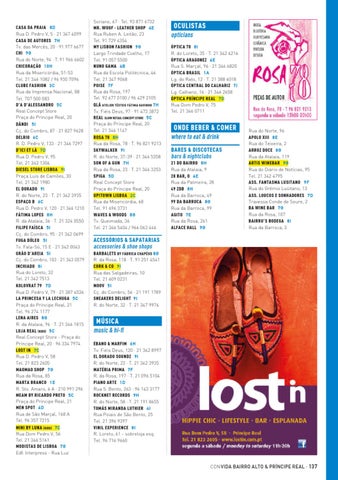 CASA DA PRAIA 8D Rua D. Pedro V, 5 · 21 347 4099 CASA DE AUTORES 7H Tv. das Mercês, 20 · 91 977 6677 CHI 9G Rua do Norte, 94 · T. 91 966 6602 CHICORAÇÃO 10H Rua da Misericórdia, 51-53 Tel. 21 346 1082 / 96 930 7096 CLUBE FASHION 3C Rua da Imprensa Nacional, 88 Tel. 707 500 083 D’A D’ALESSANDRO 5C Real Concept Store Praça do Príncipe Real, 20 DÂNDI 5I Cç. do Combro, 87 · 21 827 9628 DELRIO 6C R. D. Pedro V, 133 · 21 346 7297 D’ICI ET LÀ 7D Rua D. Pedro V, 95 Tel. 21 343 1304 DIESEL STORE LISBOA 9I Praça Luís de Camões, 30 Tel. 21 342 1980 EL DORADO 9I R. do Norte, 23 · T. 21 342 3935 ESPAÇO B 6C Rua D. Pedro V, 120 · 21 346 1210 FÁTIMA LOPES 8H R. da Atalaia, 36 · T. 21 324 0550 FILIPE FAÍSCA 5I Cç. do Combro, 95 · 21 342 0699 FUGA DÓLEO 5I Tv. Fala-Só, 15 E · 21 342 0043 GRÃO D’AREIA 5I Cç. do Combro, 103 · 21 343 0579 INCHIADO 8i Rua do Loreto, 32 Tel. 21 342 7513 KOLOVRAT 79 7D Rua D. Pedro V, 79 · 21 387 4536 LA PRINCESA Y LA LECHUGA 5C Praça do Príncipe Real, 21 Tel. 96 274 1177 LENA AIRES 8G R. da Atalaia, 96 · T. 21 346 1815 LOJA REAL (KIDS) 5C Real Concept Store - Praça do Príncipe Real, 20 · 96 334 7974 LOST IN 7C Rua D. Pedro V, 58 Tel. 21 823 2605 MAOMAO SHOP 7G Rua da Rosa, 85 MARTA BRANCO 1E R. Sto. Amaro, 6 A · 210 991 296 MEAM BY RICARDO PRETO 5C Praça do Príncipe Real, 21 MEN SPOT 4D Rua de São Marçal, 168 A Tel. 96 357 7215 MINI BY LUNA (KIDS) 7C Rua Dom Pedro V, 56 Tel. 21 346 5161 MODISTAS DE LISBOA 7G Edf. Interpress - Rua Luz