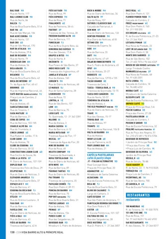 FIÉIS AO FADO 7 G Rua da Rosa, 99 FIÉIS EXPRESS 7 H Rua da Rosa, 71 FINALMENTE 4 E Rua da Palmeira, 38 r/c FOXTROT 3 F Travessa de Sta. Teresa, 28 FREEDOM BAIRRO ALTO 8 G Rua da Barroca, 111 FUNICULAR 7 J Rua da Bica Duarte Belo, 44 GINGINHA DAS GÁVEAS 9 I Rua das Gáveas, 17 A GRAPES & BITES 9 H Rua do Norte, 8 INCÓGNITO 3 I Rua Poiais de São Bento, 37 INDIE ROCK CAFÉ 7 G Travessa dos Inglesinhos, 49 JANELA D’ATALAIA 8 F Rua da Atalaia, 160 JURGEN’S 9 H Rua do Diário de Notícias, 68 LE MARAIS 5 J Rua de Santa Catarina, 28 LISBURGUER 7 H Rua da Rosa, 72 LONTRA, A 1 E Rua de São Bento, 157 LOW 8 H Rua da Barroca, 75 LUSO CAFÉ 9 G Tv. Queimada, 12 · 21 342 2281 MAJONG 8 I Rua da Atalaia, 3 MARIA CAXUXA 8 I Rua da Barroca, 6-12 MARIA NOTA BAR 9 F Travessa Água da Flor, 17 MEZCAL 8 F Travessa da Água da Flor, 20 MINI DO BAIRRO 8 H Rua da Rosa, 48 MOJITO COMPANY 9 G Travessa da Queimada, 4 NOVA TERTÚLIA BAR 9 H Rua do Diário de Notícias, 60 OITO NOVE 8 H Rua da Barroca, 89 PÁGINAS TANTAS 9 G Rua do Diário de Notícias, 85 PAI TIRANO 7 J Travessa da Laranjeira, 35 PAVILHÃO CHINÊS 7 D Rua Dom Pedro V, 89-91 PONCHA DO BAIRRO 8 H Rua da Barroca, 75 POP OUT BAR GALERIA 7 J Rua da Bica Duarte Belo, 31 PORTAS LARGAS 8 G Rua da Atalaia, 105 PRIMAS 8 F Rua da Atalaia, 154 PUREX CLUBE 8 I Rua das Salgadeiras, 28 QUIOSQUE-BAR 9 D Miradouro S. Pedro de Alcântara