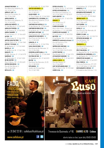 R. da Atalaia, 53 · 21 347 6275 MINHOTO, O 8 F Tv. Boa Hora, 23 · 21 342 3262 NOVAMESA RESTAURANTE 3 D Rua Marcos Portugal, 1 Tel. 21 396 6287 / 91 970 3043 ORPHEU CAFFÉ 5 D Praça do Príncipe Real, 5 A Tel. 21 804 4499 PAP’AÇORDA 8 H R. da Atalaia, 57 · T. 21 346 4811 PAPAS, O 4 A Rua Nova de São Mamede, 68 Tel. 21 387 9148 PEDRO E O LOBO 4 A Rua do Salitre, 169 · 211 933 719 PETISCOS NO BAIRRO 8 F Rua da Atalaia, 133 Tel. 91 957 4498 PHARMACIA 6 J Rua Marechal Saldanha, 1 Tel. 21 346 2146 PÕE-TE NA BICHA 8 F Tv. Água da Flor, 36 · 21 342 5924 PRIMAVERA DO JERÓNIMO, A 9 H Tv. da Espera, 34 · T.21 342 0477 PRÍNCIPE DO CALHARIZ 6 I Cç. do Combro, 28 · 21 342 0971 REAL FÁBRICA 2 A R. Escola Politécnica, 277-279 Tel. 21 387 0456 / 21 385 2090 RESTAURANTE O SÉCULO 5 F R. Academia das Ciências, 1-1A