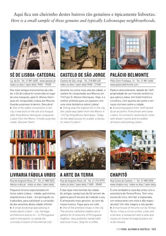 É uma verdadeira casa das artes com a assinatura de Teresa Ricou. Tem uma escola de circo, tem bar e esplanada, um restaurante com vista e dão espectáculos! Um sítio mágico a não perder. 3 A true house of the arts run by Teresa Ricou. It has a circus school, a bar and a terrace, a restaurant with a view and it puts on shows! A magical place not to be missed. CON VIDA ALFAMA & CASTELO · 143
