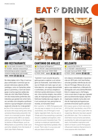 “Cantinho” é um conceito tão português que para o explicar a um estrangeiro só mostrando. José Avillez tem o seu no Chiado com tudo o que um cantinho deve ter: um espaço descontraído e confortável, um serviço simpático e informal e pratos deliciosos e irresistíveis. Uma cozinha simples, mas sofisticada, de inspiração portuguesa com influências trazidas das suas viagens. Já é um sucesso por isso, para provar as receitas, só marcando mesa! 3 A ‘cantinho’ is 100% Portuguese and the only way to explain it is to visit one. José Avillez, one of Portugal’s most highly-regarded chefs, has his own in Chiado and it has everything a cantinho should: a laidback atmosphere, informal service and irresistible food. The cooking is simple yet sophisticated, Portuguese inspired but globally influenced. That’s why it’s a success and why you have to book early!