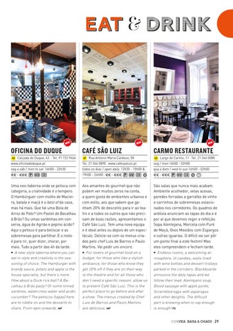São salas que nunca mais acabam. Ambiente acolhedor, velas acesas, paredes forradas a garrafas de vinho e carrinhos de sobremesas estacionados nos corredores. Os quadros de ardósia anunciam as tapas do dia e é por aí que devemos reger a refeição. Sopa Alentejana, Morcela com Puré de Maçã, Ovos Mexidos com Espargos e outras iguarias. O difícil vai ser pôr um ponto final a este festim! Mas eles compreendem e fecham tarde. 3 Endless rooms, a welcoming atmosphere, lit candles, walls lined with wine bottles and dessert trolleys parked in the corridors. Blackboards announce the daily tapas and we follow their lead: Alentejano soup, Blood sausage with apple purée, Scrambled eggs with asparagus and other delights. The difficult part is knowing when to say enough is enough! PS CON VIDA BAIXA & CHIADO · 29