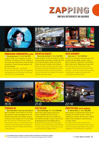 Rua da Alfândega, 114 · Tel. 21 886 8050 Passe pela hamburgueria gourmet a provar novidades da carta, como o hambúrguer de chili ou o Fartabrutos, com várias camadas. E veja o novo mural desenhado pelo artista Miguel Brum. 3 Sample the new gourmet hamburger options, like the Chilliburger and Fartabrutos, with various layers. And check out the mural by the artist Miguel Brum.