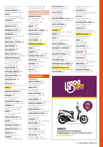 Rua de São Nicolau, 51 Tel. 21 346 2005 LEITARIA CAMPONEZA 6D Rua dos Sapateiros, 155-157 LIQUID 6F Rua Nova do Almada, 45 A Tel. 21 346 6034 / 91 764 6195 MC DONALD’S • Armazéns do Chiado 5E • Rossio 81-83 6A MERCEARIA TOSCA 1H Rua Nova do Carvalho, 72 MERENDINHA DO ARCO 6C Rua dos Sapateiros, 232 MERENDINHA, A 8B Rua Condes de Monsanto, 4 A APRAZÍVEL 5E Rua Garrett, 19 (pátio) MUSEU CHIADO - CAFETARIA 4G Rua Serpa Pinto, 4 NICOLA GOURMET 5B Rua 1º de Dezembro, 12 NOVA POMBALINA 9F Rua do Comércio, 2 OUTRA FACE DA LUA, A 7D Rua Assunção, 22 · 21 886 3430 PADARIA PORTUGUESA, A • Praça Luís de Camões, 44 Tel. 21 342 6346 2E • Rua do Ouro, 175 Tel. 21 346 8030 6E PADARIA RATTON 4B Largo Duque de Cadaval PASTELARIA CARMELITA 5D Rua do Carmo, 88 PASTELARIA POMONA 8E Rua da Prata, 113 PASTELARIA SUIÇA 6B Rossio, 96 POLLUX CAFÉ 8C Rua dos Fanqueiros, 276 - 9º QUINOA 2F Rua Alecrim, 54 · T. 21 347 9326 QUIOSQUE DE REFRESCO 2E Praça Luís de Camões ROSCOKING 8E Rua de São Nicolau, 22 Tel. 91 786 7974 SACRAMENTO DO CHIADO 5D Calçada do Sacramento, 40-46 STARBUCKS 5E • Armazéns do Chiado 5E • Estação do Rossio 4A SUBWAY 7C Rua dos Correeiros, 173 Tel. 21 342 7101 TÁBUAS CHARCUTARIA 7A Rua Barros Queiróz, 45-51 TARTINE 3F Rua Serpa Pinto, 15 TASQUINHA DO CELEIRO 5B Rua 1º de Dezembro, 51 TENDINHA DO ROSSIO, A 6C Rossio, 6 VERTIGO CAFÉ 4D Travessa do Carmo, 4 VITAMINAS • Armazéns do Chiado 5E