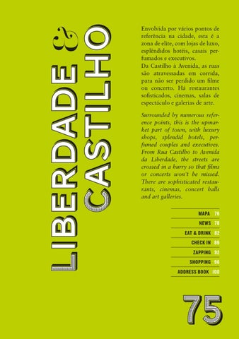 Envolvida por vários pontos de referência na cidade, esta é a zona de elite, com lojas de luxo, esplêndidos hotéis, casais perfumados e executivos. Da Castilho à Avenida, as ruas são atravessadas em corrida, para não ser perdido um filme ou concerto. Há restaurantes sofisticados, cinemas, salas de espectáculo e galerias de arte. Surrounded by numerous reference points, this is the upmarket part of town, with luxury shops, splendid hotels, perfumed couples and executives. From Rua Castilho to Avenida da Liberdade, the streets are crossed in a hurry so that films or concerts won't be missed. There are sophisticated restaurants, cinemas, concert halls and art galleries. MAPA 76 NEWS 78 EAT & DRINK 82 CHECK IN 86 ZAPPING 92 SHOPPING 96 ADDRESS BOOK 100