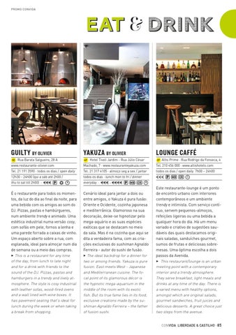 Este restaurante-lounge é um ponto de encontro urbano com interiores contemporâneos e um ambiente trendy e intimista. Com serviço contínuo, servem pequenos-almoços, refeições ligeiras ou uma bebida a qualquer hora do dia. Há um menu variado e criativo de sugestões saudáveis das quais destacamos originais saladas, sanduíches gourmet, sumos de frutas e deliciosas sobremesas. Uma óptima escolha a dois passos da Avenida. 3 This restaurant/lounge is an urban meeting point with a contemporary interior and a trendy atmosphere. They serve breakfast, light meals and drinks at any time of the day. There is a varied menu with healthy options, amongst which are original salads, gourmet sandwiches, fruit juices and delicious desserts. A great choice just two steps from the avenue. CON VIDA LIBERDADE & CASTILHO · 85