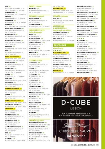 PABE 3D Rua Duque de Palmela, 27 A Tel. 21 353 5675 / 21 353 7484 PEDRO E O LOBO 2F Rua do Salitre, 169 · 211 933 719 PINÓQUIO 6J Restauradores 79 · 21 346 5106 QUEBRA-MAR 5H Av. Liberdade, 77 · T. 21 346 4855 QUERMESSE 5i R. da Glória, 85 · Tel. 211 507 901 RENDEZ-VOUS COFFEE SHOP 3F Hotel Altis - Rua Castilho, 11 Tel. 21 310 6000 RESTAURANTE 33 3E Rua Alexandre Herculano, 33 A Tel. 21 354 6079 RESTAURANTE DO TEATRO 5G Hotel NH · Av. Liberdade, 180 Tel. 21 351 4060 RIBADOURO 4G Av. Liberdade, 155 · 21 354 9411 RISO8 5E Rua Rodrigues Sampaio, 94 Tel. 21 315 0233 ROSSIO RESTAURANTE & BAR 6J Altis Avenida Hotel · Rua 1º de Dezembro, 120 · 210 440 008 RUBRO AVENIDA 5E Rua Rodrigues Sampaio, 35 Tel. 21 314 4656 SABOR & ARTE 1C Pateo Bagatella · Rua Artilharia Um, 51 · Tel. 21 386 5390 SANCHO 5H Tv. da Glória, 14 · 21 346 9780 SERVEJARIA 6J Restauradores, 64 · 21 347 8274 SOL DOURADO 6J Rua Jardim Regedor, 19-25 Tel. 21 347 2570 SOLAR DOS PRESUNTOS 6H Rua Portas de Santo Antão, 150 Tel. 21 342 4253 SOLMAR 6I Rua Portas de Santo Antão, 108 Tel. 21 342 3371 TERRAÇO (HOTEL TIVOLI LISBOA) 4F Av. Liberdade, 185 · 21 319 8934 THE BAR (HOTEL FONTECRUZ) 5G Av. Liberdade, 138 · 21 041 0000 TIVOLI CAFFÈ 5F Avenida da Liberdade, 185 Tel. 21 319 8834 VARANDA (HOTEL RITZ) 1B Rua Rodrigo da Fonseca, 88 Tel. 21 381 1400 VARANDA CASTILHO 3F Rua Castilho, 14 C - 7º Tel. 21 314 1045 CS VINTAGE RESTAURANTE BAR 2F Rua Rodrigo da Fonseca, 2 Tel. 210 405 400 XENÚ 3D Rua Duque de Palmela, 27 D Tel. 21 357 8406 ZÉ VARUNCA 6H Rua São José, 54 · 21 346 8018