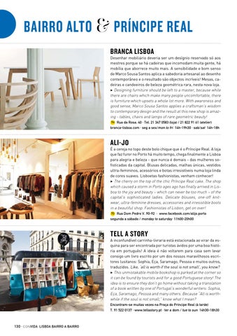 É a cereja no topo deste bolo chique que é o Príncipe Real. A loja que faz furor no Porto há muito tempo, chega finalmente a Lisboa para alegria e beleza - que nunca é demais - das mulheres sofisticadas da capital. Blusas delicadas, malhas únicas, vestidos ultra-femininos, acessórios e botas irresistíveis numa loja linda de cores suaves. Lisboetas fashionistas, venham conhecer! 3 The cherry on the top of the chic Príncipe Real cake. The shop which caused a storm in Porto ages ago has finally arrived in Lisboa to the joy and beauty – which can never be too much – of the capital’s sophisticated ladies. Delicate blouses, one-off knitwear, ultra-feminine dresses, accessories and irresistible boots in a beautiful shop. Fashionistas of Lisbon, get on over! 7D Rua Dom Pedro V, 90-92 · www.facebook.com/alijo.porto segunda a sábado / monday to saturday 11h00-20h00
