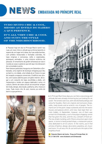 3 Passear hoje em dia no Príncipe Real é sentir nas ruas um novo ritmo e atitude que já fervia baixinho à espera de um lugar em Lisboa. As ruas estão bonitas, com prédios restaurados e fachadas coloridas, há lojas originais e exclusivas, cafés e esplanadas, quiosques animados, e uma mistura ecléctica de pessoas. O romantismo do jardim atravessa as ruas e inunda as casas e palácios que até aqui nos deixavam de curiosidade à porta. Num desses palacetes inaugurou em Setembro a Embaixada, uma espécie de boutique-shopping que deu ao bairro, e à cidade, uma lufada de ar fresco no que diz respeito a espaços comerciais. O edifício neo-árabe, com 3 pisos abertos para um pátio interior, dá lugar a um conjunto de lojas escolhidas a dedo, um restaurante e ainda um espaço dedicado à arte e à cultura. Dentro de salas únicas vai encontrar artigos de moda, design, decoração, joalharia, arte, música e mais. Tudo muito chic & cool, mesmo ao estilo do bairro a que pertence. 3 In Príncipe Real these days you can feel a new energy and attitude that was already simmering but just looking for an outlet. The streets look nice, with refurbished buildings and colourful façades, there are original and exclusive shops, cafés, lively kiosks and an eclectic mix of people. The romanticism of the park creeps outwards and into the exotic houses and palaces which, until now, have kept their secrets hidden. In September, however, one of them was turned into Embaixada, a sort of boutique shopping centre that has given the area, and the city, a breath of fresh air. The neo-Arabic building, with 3 floors around an open inner space, is home to hand-picked shops, a restaurant and an area dedicated to art & culture. In the rooms, you’ll find articles of fashion, design, decoration, jewellery, art, music and more. It’s all very chic & cool and suits the style of the neighbourhood. 5C Palacete Ribeiro da Cunha · Praça do Príncipe Real, 26 Tel. 21 340 4150 · www.facebook.com/Embaixada