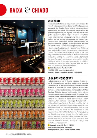 Muda o assunto na rua do Arsenal mas sem desconversar. A Loja das Conservas abriu portas numa parceria com a Associação Nacional dos Industriais de Conservas de Peixe, a entidade que reúne a grande maioria das marcas de conservas deste nosso mar salgado. Latinhas Ramirez, Pinhais, Luças, La Gondola, entre outras, compõem as paredes onde cada história é contada. Têm sardinha, cavala, filetes de chaputa e muitas mais iguarias a encher-nos a barriga de ideias. Depois, fica só a faltar uma mesa, hora marcada e um amigo. Bom proveito! 3 The subject may change in Rua do Arsenal but there’s still plenty to talk about. Loja das Conservas is a co-venture with the national fish canning association (ANICP), the umbrella body for most of the companies in the industry. Cans of tinned fish by Ramirez, Pinhais, Luças, La Gondola and other brands line the walls which recount the history of each of them. Sardines, mackerel, octopus and much, much more to fill your head, and stomach, with ideas. All that’s missing is a table, a time and a friend. "Bon appétit"! 3i Rua do Arsenal, 130 · Tel. 91 118 1210 todos os dias / open daily 9h30-20h00 (domingo fecha às 19h00 / sunday closes at 19h00)