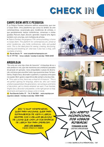 É no Palácio Pombal, belíssimo edifício seiscentista, que vive a Carpe Diem. Uma plataforma que actua no âmbito da arte contemporânea, vocacionada para residências de artistas, e que paralelamente realiza conferências, conversas e visitas guiadas. Para ver, fazer, discutir, aprender, respirar arte. Agora também com uma loja, com múltiplos de artistas. 3 Palácio Pombal, the gorgeous 17th-century building, is home to Carpe Diem. This platform for contemporary art, aimed at artist residencies, also holds conferences, talks and guided visits. This is the ideal place for seeing, creating, discussing, learning and breathing art. And now it also has a shop, with multiples of artists. 6F Rua do Século, 79 · www.carpediemartepesquisa.com Tel. 21 197 7102 · terça a sábado / tuesday to saturday 15h00-22h00