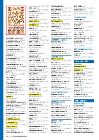 Rua D. Pedro V, 58 · 91 775 9282 LOURO & SAL 8H Rua da Atalaia, 53 · 21 347 6275 MATCHIK TCHIK 7J Rua da Bica Duarte Belo, 51 Tel. 93 822 4482 MINHOTO, O 8F Tv. Boa Hora, 23 · 21 342 3262 ORPHEU CAFFÉ 5D Pç. Príncipe Real, 5A · 21 804 4499 PAP’AÇORDA 8H R. da Atalaia, 57 · T. 21 346 4811 PAPAS, O 4A Rua Nova de São Mamede, 68 Tel. 21 387 9148 PARLATÓRIO 2E R. S. Bento, 334 · 91 293 4850 PÁTIO DO BAIRRO 8H R. da Atalaia, 35 · T. 21 343 1822 PEDRO E O LOBO 4A Rua do Salitre, 169 · 211 933 719 PETISCOS NO BAIRRO 8F Rua da Atalaia, 133 Tel. 91 957 4498 PHARMACIA 6J Rua Marechal Saldanha, 1 Tel. 21 346 2146 PÕE-TE NA BICHA 8F Tv. Água da Flor, 36 · 21 342 5924 PREGO DA PEIXARIA, O 4B Rua da Escola Politécnica, 40 Tel. 21 347 1356 PRIMAVERA DO JERÓNIMO, A 9H Tv. da Espera, 34 · T.21 342 0477 PRÍNCIPE DO CALHARIZ 6I Cç. do Combro, 28 · 21 342 0971 REAL FÁBRICA 2A R. Escola Politécnica, 277-279 Tel. 21 387 0456 / 21 385 2090 RESTAURANTE O SÉCULO 5F R. Academia das Ciências, 1-1A Tel. 21 324 3755 ROSA DA RUA 7E R. da Rosa, 265 · T. 21 343 2195 ROTA DAS SEDAS 2A Rua da Escola Politécnica, 231 Tel. 21 387 4472 SALGADEIRAS, AS 8I Rua das Salgadeiras, 18 Tel. 21 342 1157 SANTA BICA 6J Tv. do Cabral, 38 · T. 21 823 4089 SEA ME · PEIXARIA MODERNA 9I Rua Loreto, 21 · T. 21 346 1564 SINAL VERDE 5I Cç. do Combro, 42 · 21 342 1601 SINAL VERMELHO 9G R. das Gáveas, 89 · 21 346 1252 SNOB BAR 6D R. do Século, 178 · 21 346 3723 STASHA 9I R. das Gáveas, 33 · 21 343 1131 SUL 9I Rua Norte, 13 · Tel. 21 346 2449 TABERNA DA BARROCA 8H R. da Barroca, 92 · 21 347 6112 TABERNA PORTUGUESA 5i Cç. Combro, 115 · 91 428 9997