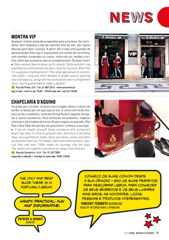 Qualquer mulher gosta de se aperaltar para uma festa. Ser sorridente, bem-disposta e não dar opiniões fora do tom, são regras básicas para fazer sucesso. A partir daí é tudo uma questão de apresentação! Esta loja é especialista em outfits de cerimónia, com vestidos compridos ou curtos, cheios de cor, rendas e brilhos, além dos acessórios que os complementam. De fazer furor! 3 Every woman likes to dress up for a party. Smile and don’t say anything too controversial are basic rules for success. After that it’s a question of presentation! This shop specialises in ceremonial outfits - long and short dresses in bright colours sporting lace and sequins, along with the accessories which complement them. You’re guaranteed to make a splash! 7C Rua da Prata, 210 · Tel. 21 887 2216 · www.amontra.pt seg a sáb / mon to sat 9h30 - 19h30 (sáb até / sat till 19h00)