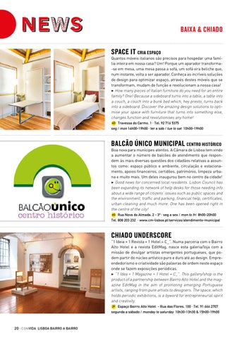 Boa nova para munícipes atentos. A Câmara de Lisboa tem vindo a aumentar o número de balcões de atendimento que respondem às mais diversas questões dos cidadãos relativas a assuntos como: espaço público e ambiente, circulação e estacionamento, apoios financeiros, certidões, património, limpeza urbana e muito mais. Um deles inaugurou bem no centro da cidade! 3 Good news for concerned local residents. Lisbon Council has been expanding its network of help desks for those needing info about a wide range of citizens’ issues such as public spaces and the environment, traffic and parking, financial help, certificates, urban cleaning and much more. One has been opened right in the centre of the city! 6G Rua Nova do Almada, 2 - 3º · seg a sex / mon to fri 8h00-20h00 Tel. 808 203 232 · www.cm-lisboa.pt/servicos/atendimento-municipal