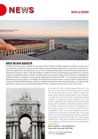 O Terreiro do Paço começa a compôr-se aos nossos olhos! A última novidade propagou-se de boca em boca, que é como quem diz, de share em share e, durante algumas noites de Agosto, toda a praça se encheu de curiosos que assistiram à magnificência do espectáculo. Luz, cor e som envolveram toda a gente numa aventura épica libertando exclamações de espanto e alegria. Tudo para celebrar a reabertura do Arco da Rua Augusta que durante seis meses foi sujeito a uma profunda limpeza e restauro. A grande notícia é que, a partir de agora o Arco do Triunfo - entrada gloriosa da Baixa Pombalina, integrado no novo plano da cidade após o terramoto de 1755 - é um monumento que pode ser visitado até ao seu topo, graças a um elevador. A vista daqui não nos deixa mentir, é única e superior. À altura das esculturas de Célestin Anatole Calmels, vemos por completo uma das mais nobres zonas de Lisboa e o rio Tejo, de onde partilhamos, não sem um certo sentimento de glória interior, o mesmo horizonte que D. José I, ali no centro. 3 Terreiro do Paço is taking shape before our very eyes! The most recent event spread by word of mouth (i.e. text by text) and for several nights in August the whole square filled with people eager to see a magnificent light and sound show which involved the massed crowds in an amazing and epic adventure. All in the name of celebrating the reopening of the Arco da Rua Augusta which had been closed for restoration work for six months. The big news is that this triumphal arch the majestic entrance to the new city built after the earthquake in 1755 - can now be visited via a lift which will take you to the very top. And the view once you get there is one of a kind. Standing level with the sculptures by Calmels, you overlook one of the city’s central areas and the river. In fact, and not without a certain sense of inner majesty, you share the same view as King José I, in the square. 8G Rua Augusta, 2 · www.visitlisboa.com todos os dias / open daily 9h00-19h00 FOTOGRAFIA / PHOTOGRAPHY EVELYN KAHN