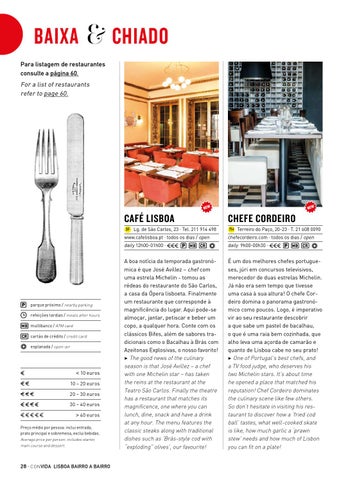 A boa notícia da temporada gastronómica é que José Avillez – chef com uma estrela Michelin - tomou as rédeas do restaurante do São Carlos, a casa da Ópera lisboeta. Finalmente um restaurante que corresponde à magnificência do lugar. Aqui pode-se almoçar, jantar, petiscar e beber um copo, a qualquer hora. Conte com os clássicos Bifes, além de sabores tradicionais como o Bacalhau à Brás com Azeitonas Explosivas, o nosso favorito! 3 The good news of the culinary season is that José Avillez – a chef with one Michelin star – has taken the reins at the restaurant at the Teatro São Carlos. Finally the theatre has a restaurant that matches its magnificence, one where you can lunch, dine, snack and have a drink at any hour. The menu features the classic steaks along with traditional dishes such as ‘Brás-style cod with “exploding” olives’, our favourite!