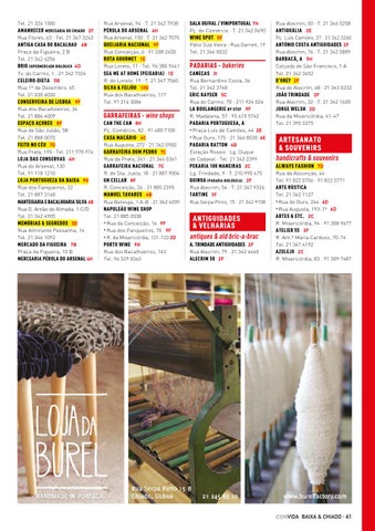 Rua Arsenal, 94 · T. 21 342 7938 PÉROLA DO ARSENAL 4H Rua Arsenal, 150 · T. 21 342 7075 QUEIJARIA NACIONAL 9F Rua Conceição, 6 · 91 208 2450 ROTA GOURMET 1E Rua Loreto, 11 · Tel. 96 380 9441 SEA ME AT HOME (PEIXARIA) 1E R. do Loreto, 19 · T. 21 347 7060 SILVA & FEIJÓO 10G Rua dos Bacalhoeiros, 117 Tel. 91 216 3084