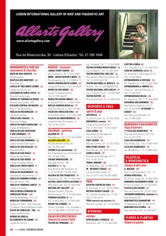 GALERIAS · galleries ALECRIM 50 3F Rua Alecrim, 50 · T. 21 346 5258 ALLARTS GALLERY 2D Rua da Misericórdia, 30 Tel. 21 795 1034 CHIADO 8 ARTE CONTEMPORÂNEA 3E Ed. Fidelidade, Lg. do Chiado, 8 Tel. 21 340 1678 CHIADO UNDERSCORE 2F Rua das Flores, 100 GALERIA 3 + 1 3g Rua António Mª Cardoso, 31 T. 21 017 0765 · 93 239 7062 GALERIA DE SÃO FRANCISCO 5F Rua Ivens, 40 · Tel. 21 346 3460 GALERIA JOÃO ESTEVES DE OLIVEIRA 5F Rua Ivens, 38 · Tel. 21 325 9940 MEETING ART GALLERY 3E Espaço Chiado · Rua da Misericórdia, 12 · T. 96 586 5454 PEQUENA GALERIA, A 1J Av. 24 de Julho, 4 · 21 826 4081 ROUND THE CORNER 3C Teatro Trindade - Lg. Trindade, 1 Tel. 21 342 0000 / 210 027 153
