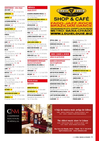 MÚSICA music & hi-fi ACADEMIA AMADORES MÚSICA 3C Rua Nova da Trindade, 18 - 2º Tel. 21 342 5022 COMPANHIA NACIONAL MÚSICA 6F Rua Nova do Almada, 60 Tel. 21 342 0918 DISCOLECÇÃO 4B Cç do Duque, 53 A · 21 347 1486 DISCOTECA AMÁLIA 6C Rua do Ouro, 272 · 21 342 0939 FNAC 5E Armazéns Chiado · 707 31 34 35 LISBOA CIDADE DO FADO 5D Rua do Carmo, (carrinha) nº 51 Tel. 21 347 0276 LOUIE LOUIE LISBOA 5E Escadinhas do Sto. Espírito da Pedreira, 100 · Tel. 21 347 2232 MAGIC BUS RECORDS 4B Cç. do Duque, 17 A · 21 347 8105 MK2 (DJ) 2G Rua Flores, 41-43 · 21 315 0374 TREM AZUL (JAZZ) 2H R. Alecrim, 21 A · T. 21 342 3141
