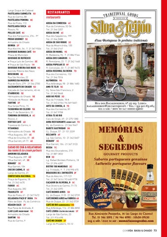 RESTAURANTES restaurants ADEGA DA CONDESSA 4C Rua da Condessa, 52-54 Tel. 21 346 3207 ADEGA DA MÓ 6C Rua dos Sapateiros, 199 Tel. 21 346 5088 ADEGA DE SÃO ROQUE 2C Rua da Misericórdia, 120 Tel. 21 343 2167 ADEGA DO MANEL 9E R. Madalena, 94 · T. 21 886 9164 ADEGA DOS CANÁRIOS 1i R. Remolares, 23 · T. 21 342 1468 ADEGA POPULAR 33 8F R. Conceição, 33 · T. 21 887 9472 ADEGA REGIONAL DA BEIRA 7D Rua dos Correeiros, 132 Tel. 21 346 7014 ALFÂNDEGA 9G Rua Alfândega, 98 · 21 886 1683 AMO-TE TEJO 5E Cç. Nova São Francisco, 2 Tel. 21 342 0668 AQUI HÁ PEIXE 3D Rua da Trindade, 18 A Tel. 21 343 2154 / 96 369 5601 ARTE DA COMIDA, A 7E Rua dos Correeiros, 81 Tel. 21 347 9708 ATIRA-TE AO RIO Cais do Ginjal, 69 · 21 275 1380 AURA RESTAURANTE LOUNGE CAFÉ 7H Pç. do Comércio · 21 346 9447 BABETE GASTROBAR 3B Cç. Duque, 57 · 21 151 3339 BELCANTO 4F Lg. São Carlos, 10 · 21 342 0607 BENARD’ 3E Rua Garrett, 104 · 21 347 3133 BESSA 7C Rua dos Douradores, 210 Tel. 21 887 3832 BCN 3D Lg. Rafael Bordalo Pinheiro, 18 Tel. 21 396 6287 BISTRO 100 MANEIRAS 2C Lg. Trindade, 9 · T. 210 990 475 BRASSERIE DE L’ENTRECÔTE 2F Rua do Alecrim, 117-121 Tel. 21 347 3616 / 93 648 9778 CAÇADOR DA OLIVEIRA, O 3C Rua Oliveira ao Carmo, 71-73 Tel. 21 342 3395 CAFÉ BUENOS AIRES 3B Cç. do Duque, 31 B · 21 342 0739 CAFÉ BUENOS AIRES NA FÁBRICA 4B Rua do Duque, 22 · 21 342 0739 CAFÉ DO RIO HAMBURGUERIA 10G Rua Alfândega, 114 · 21 886 8050 CAFÉ LISBOA (TEATRO SÃO CARLOS) 3F Largo de São Carlos, 23 Tel. 211 914 498 CAFÉ NO CHIADO 3F Largo do Picadeiro, 10-12 CON VIDA BAIXA & CHIADO · 73