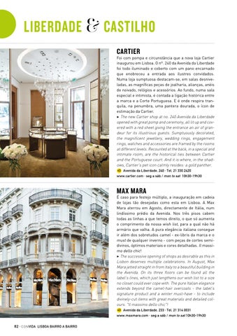 Foi com pompa e circunstância que a nova loja Cartier inaugurou em Lisboa. O nº. 240 da Avenida da Liberdade foi todo iluminado e coberto com um pano encarnado que enobreceu a entrada aos ilustres convidados. Numa loja sumptuosa destacam-se, em salas desniveladas, as magníficas peças de joalharia, alianças, anéis de noivado, relógios e acessórios. Ao fundo, numa sala especial e intimista, é contada a ligação histórica entre a marca e a Corte Portuguesa. E é onde respira tranquila, na penumbra, uma pantera dourada, o ícon de estimação da Cartier. 3 The new Cartier shop at no. 240 Avenida da Liberdade opened with great pomp and ceremony, all lit up and covered with a red sheet giving the entrance an air of grandeur for its illustrious guests. Sumptuously decorated, the magnificent jewellery, wedding rings, engagement rings, watches and accessories are framed by the rooms at different levels. Recounted at the back, in a special and intimate room, are the historical ties between Cartier and the Portuguese court. And it is where, in the shadows, Cartier’s pet icon calmly resides: a gold panther. 4D Avenida da Liberdade, 240 · Tel. 21 330 2420 www.cartier.com · seg a sáb / mon to sat 10h30-19h30