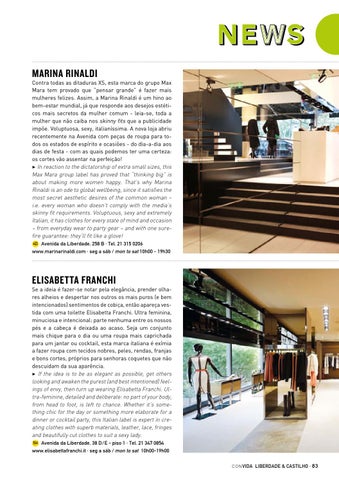 Contra todas as ditaduras XS, esta marca do grupo Max Mara tem provado que “pensar grande” é fazer mais mulheres felizes. Assim, a Marina Rinaldi é um hino ao bem-estar mundial, já que responde aos desejos estéticos mais secretos da mulher comum - leia-se, toda a mulher que não caiba nos skinny fits que a publicidade impõe. Voluptuosa, sexy, italianíssima. A nova loja abriu recentemente na Avenida com peças de roupa para todos os estados de espírito e ocasiões - do dia-a-dia aos dias de festa - com as quais podemos ter uma certeza: os cortes vão assentar na perfeição! 3 In reaction to the dictatorship of extra small sizes, this Max Mara group label has proved that “thinking big” is about making more women happy. That’s why Marina Rinaldi is an ode to global wellbeing, since it satisfies the most secret aesthetic desires of the common woman – i.e. every woman who doesn’t comply with the media’s skinny fit requirements. Voluptuous, sexy and extremely Italian, it has clothes for every state of mind and occasion – from everyday wear to party gear – and with one surefire guarantee: they’ll fit like a glove! 4D Avenida da Liberdade, 258 B · Tel. 21 315 0206 www.marinarinaldi.com · seg a sáb / mon to sat 10h00 - 19h30