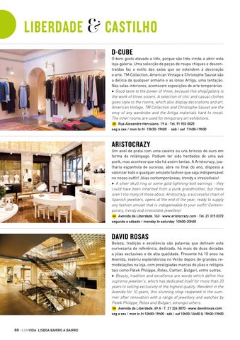Beleza, tradição e excelência são palavras que definem esta ourivesaria de referência, dedicada, há mais de duas décadas a jóias exclusivas e de alta qualidade. Presente há 10 anos na Avenida, reabriu esplendorosa no Verão depois de grandes remodelações na loja, com prestigiadas marcas de jóias e relógios tais como Patek Philippe, Rolex, Cartier, Bulgari, entre outras. 3 Beauty, tradition and excellence are words which define this supreme jeweller’s, which has dedicated itself for more than 20 years to selling exclusivity of the highest quality. Resident in the Avenida for 10 years, this stunning shop reopened in the summer after renovation with a range of jewellery and watches by Patek Philippe, Rolex and Bulgari, amongst others. 5H Avenida da Liberdade, 69 A · T. 21 324 3870 · www.davidrosas.com seg a sex / mon to fri 10h00-19h00 · sáb / sat 10h00-14h00 & 15h00-19h00