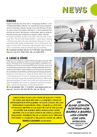 Claudia Cardinale não teria sido a "A Rapariga da Mala" e sim "A Rapariga de Mãos a Abanar" se, naquele dia em que a abandonaram na estrada, levasse consigo uma mala Rimowa. Porque, na certa, teriam-lhe levado a Rimowa. É a marca preferida das estrelas de cinema. Resistentes e sofisticadas, agora à venda na Avenida, prontas para embelezar as viagens Lisboa > Mundo. 3 Claudia Cardinale wouldn’t have been "The Girl with a Suitcase" but “The Girl with Empty Hands" if she’d been carrying a Rimowa bag when she was abandoned. Because for sure it would have been stolen straight away. This is the favourite luggage of movie stars. Strong and sophisticated, they’re now on sale in the Avenida, ready to embellish any trip anywhere. 5G Avenida da Liberdade, 160-162 · Tel. 91 507 7465 · www.rimowa.de seg a sex / mon to fri 10h30-19h30 · sáb / sat 10h00-19h30