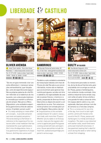 “Dá-me um gozo tremendo criar conceitos diferentes (...) provocar sensações extraordinárias, quer de paladar, como de experiência de espaço”. São as próprias palavras do chef Olivier referindo-se à reabertura do restaurante, com a decoração totalmente renovada que mantém a sofisticação de sempre. Não perca o Menu Dégustation, uma verdadeira experiência gastronómica feita de sabores únicos. E também servem sushi! 3 “It’s really satisfying to create different concepts… to provoke extraordinary taste and spatial sensations.” The words belong to Chef Olivier in reference to the reopening of his restaurant after a total makeover that has maintained the usual sophistication. Don’t miss the dégustation menu, a true gastronomic experience of unique flavours. And they also serve sushi! 96 · CON VIDA LISBOA BAIRRO A BAIRRO