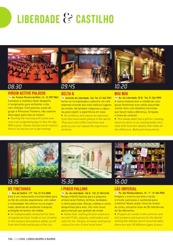 Rua do Salitre, 117 · Tel. 21 314 2038 Este é um restaurante incontornável para os fãs de comida vegetariana, com sabor e critaividade. No interior ou na esplanada, desfrute do ambiente tranquilo, protegido do bulício da cidade. 3 An indispensable restaurant for fans of vegetarian food. Inside or out, breathe in the tranquil atmosphere safely cut off from the hustle and bustle of the city.
