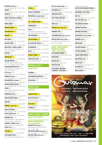 Tel. 21 354 8038 STIVALI 5H Av. Liberdade, 38 · 21 380 5110 STIVALI STOCKSHOP 2C Rua Castilho, 71 B · 21 386 0944 SUMISURA (ATELIER PARA HOMEM) 1A Rua D. Franc. Manuel Melo, 36 Tel. 21 383 3110 THE - DESIGN & MODA 2C Rua Castilho, 65 C · 21 387 4434 TIMBERLAND 5F Av. Liberdade, 196 · 21 007 9239 TOD’S 5F Avenida da Liberdade, 196 Tel. 210 079 253 / 91 950 8520 TRU TRUSSARDI 4D Av. Liberdade, 258A · 210 079 280 VESTE COUTURE 2D Rua Castilho, 59 C · 210 997 930 VIA CASTILHO BY NICA 2C Rua Castilho, 90 A · 21 386 4590 VILEBREQUIN 4E Av. Liberdade, 224A · 21 314 2646 WEILL 2C Rua Castilho, 90 · T. 21 386 9600 WICKETT JONES 2E Rua Castilho, 13 · T. 21 822 3384 ZADIG & VOLTAIRE 5H Av. Liberdade, 84-88 · 21 342 6316