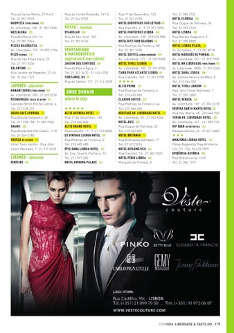 Rua 1º de Dezembro, 123 Tel. 21 321 8100 HOTEL EUROSTARS DAS LETRAS 3F Rua Castilho, 6 · T. 21 357 3094 HOTEL FONTECRUZ LISBOA 5G Av. Liberdade, 138 · 210 410 000 HOTEL RITZ FOUR SEASONS 1B Rua Rodrigo da Fonseca, 88 Tel. 21 381 1400 HOTEL SOFITEL LISBON LIBERDADE 5H Av. Liberdade, 127 · 21 322 8300 HOTEL TIVOLI LISBOA 4F Av. Liberdade, 185 · 21 319 8900 TIARA PARK ATLANTIC LISBOA 1B Rua Castilho, 149 · 21 381 8700