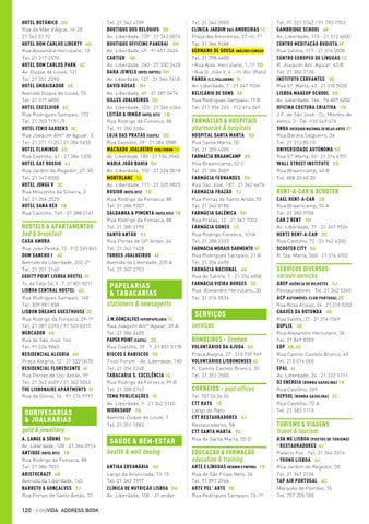 ASK ME LISBOA (POSTOS DE TURISMO) • RESTAURADORES 6J Palácio Foz · Tel. 21 346 3314 • YOUNG LISBOA 6J Rua Jardim do Regedor, 50 Tel. 21 347 2134 TAP AIR PORTUGAL 4C Marquês de Pombal, 15 Tel. 707 205 700