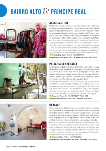 Melhor que uma loja vintage: é o armário de uma tia excêntrica, daquelas que dão festas e são o centro das atenções. Aqui não há peça em segunda mão que não seja altamente desejável - desde os casacos de pele com cortes retro, os pólos Fred Perry, os lenços de seda com padrões oh-so-classy, os vestidos, as carteiras de marca e por aí fora. Ah! E os acessórios únicos da CEAGAGÊ. 3 This is better than a vintage shop. It’s the wardrobe of an eccentric aunt, the type who holds parties and is the centre of attention. Every single second-hand item is a thing of absolute desire – from the retro-style leather jackets to the Fred Perry polo shirts, silk scarves with oh-so-classy patterns, dresses, branded handbags and so on. Oh, and the unique CEAGAGÊ accessories too! 3C Calçada Eng. Miguel Pais, 18 · Tel. 21 340 4150 www.facebook.com/jessica.store · ter a sáb / tue to sat 13h00-20h00