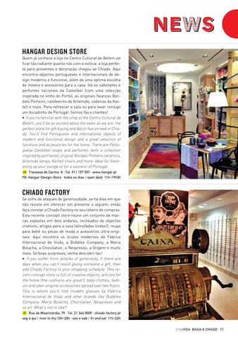 Se sofre de ataques de generosidade, se há dias em que não resiste em oferecer um presente a alguém, então faça constar a Chiado Factory no seu roteiro de compras. Esta recente concept store reúne um conjunto de marcas expostas em dois andares, recheados de objectos criativos, artigos para a casa (almofadas lindas!), roupa para bebé ou peças de moda e acessórios ultra-originais. Aqui encontra os óculos modernos da Fábrica Internacional de Visão, a Bubbles Company, a Maria Bolacha, a Chocolatier, a Nespresso, a Origem e muito mais. Só boas surpresas, venha descobri-las! 3 If you suffer from attacks of generosity, if there are days when you can’t resist giving someone a gift, then add Chiado Factory to your shopping schedule. This recent concept store is full of creative objects, articles for the home (the cushions are great!), baby clothes, fashion and uber-original accessories spread over two floors. This is where you’ll find modern glasses by Fábrica Internacional de Visão and other brands like Bubbles Company, Maria Bolacha, Chocolatier, Nespresso and so on. What’s not to like? 2C Rua da Misericórdia, 79 · Tel. 21 346 0009 · chiado-factory.pt seg a qui / mon to thu 10h-20h · sex e sáb / fri and sat 11h-22h