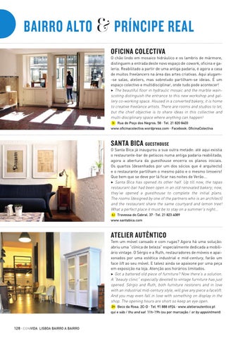 Tem um móvel cansado e com rugas? Agora há uma solução: abriu uma “clínica de beleza” especialmente dedicada a mobiliário vintage. O Sérgio e a Ruth, restauradores de móveis e apaixonados por uma estética industrial e mid-century, farão um face lift ao seu móvel. E talvez ainda se apaixone por uma peça em exposição na loja. Atenção aos horários limitados. 3 Got a battered old piece of furniture? Now there’s a solution. A “beauty clinic” especially devoted to vintage furniture has just opened. Sérgio and Ruth, both furniture restorers and in love with an industrial mid-century style, will give any piece a facelift. And you may even fall in love with something on display in the shop. The opening hours are short so keep an eye open. 2H Beco da Rosa, 2C-D · Tel. 91 888 6924 · www.atelierautentico.pt qui e sáb / thu and sat 11h-19h (ou por marcação / or by appointment)