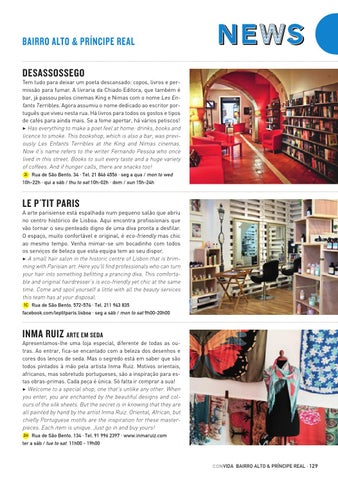 A arte parisiense está espalhada num pequeno salão que abriu no centro histórico de Lisboa. Aqui encontra profissionais que vão tornar o seu penteado digno de uma diva pronta a desfilar. O espaço, muito confortável e original, é eco-friendly mas chic ao mesmo tempo. Venha mimar-se um bocadinho com todos os serviços de beleza que esta equipa tem ao seu dispor. 3 A small hair salon in the historic centre of Lisbon that is brimming with Parisian art. Here you’ll find professionals who can turn your hair into something befitting a prancing diva. This comfortable and original hairdresser’s is eco-friendly yet chic at the same time. Come and spoil yourself a little with all the beauty services this team has at your disposal. 1C Rua de São Bento, 572-574 · Tel. 211 943 835 facebook.com/leptitparis.lisboa · seg a sáb / mon to sat 9h00-20h00