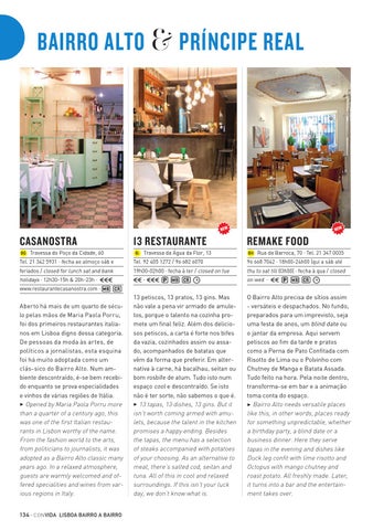 Aberto há mais de um quarto de século pelas mãos de Maria Paola Porru, foi dos primeiros restaurantes italianos em Lisboa digno dessa categoria. De pessoas da moda às artes, de políticos a jornalistas, esta esquina foi há muito adoptada como um clás-sico do Bairro Alto. Num ambiente descontraído, é-se bem recebido enquanto se prova especialidades e vinhos de várias regiões de Itália. 3 Opened by Maria Paola Porru more than a quarter of a century ago, this was one of the first Italian restaurants in Lisbon worthy of the name. From the fashion world to the arts, from politicians to journalists, it was adopted as a Bairro Alto classic many years ago. In a relaxed atmosphere, guests are warmly welcomed and offered specialities and wines from various regions in Italy. 134 · CON VIDA LISBOA BAIRRO A BAIRRO