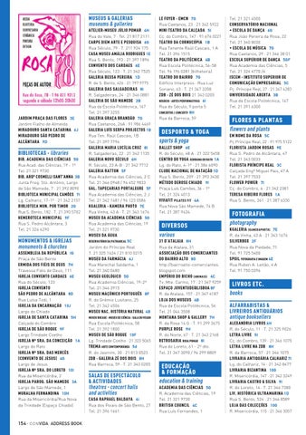 Rua Escola Politécnica, 58 Tel. 21 392 1800 MUSEU DE SÃO ROQUE 10F Lg. Trindade Coelho · 21 323 5065 TREMA ARTE COMTEMPORÂNEA 5d R. do Jasmim, 30 · 21 813 0523 ZDB - GALERIA ZÉ DOS BOIS 8H Rua Barroca, 59 · T. 21 343 0205
