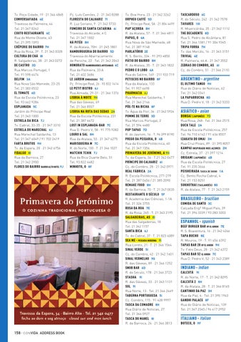 Tv. Boa Hora, 23 · 21 342 3262 ORPHEU CAFFÉ 5D Pç. Príncipe Real, 5A · 21 804 4499 PAP’AÇORDA 8H R. da Atalaia, 57 · T. 21 346 4811 PAPAS, O 4A Rua Nova de São Mamede, 68 Tel. 21 387 9148 PARLATÓRIO 2E R. S. Bento, 334 · 91 293 4850 PÁTIO DO BAIRRO 8H R. da Atalaia, 35 · T. 21 343 1822 PEDRO E O LOBO 4A Rua do Salitre, 169 · 211 933 719 PETISCOS NO BAIRRO 8F Rua da Atalaia, 133 Tel. 91 957 4498 PHARMACIA 6J Rua Marechal Saldanha, 1 Tel. 21 346 2146 PÕE-TE NA BICHA 8F Tv. Água da Flor, 36 · 21 342 5924 POMME DE TERRE 3D Rua Marcos Portugal, 2 Tel. 21 594 4480 POP TAPAS 7D R. do Jasmim, 16 · T. 96 399 8190 PREGO DA PEIXARIA, O 4B Rua da Escola Politécnica, 40 Tel. 21 347 1356 PRIMAVERA DO JERÓNIMO, A 9H Tv. da Espera, 34 · T.21 342 0477 PRÍNCIPE DO CALHARIZ 6I Cç. do Combro, 28 · 21 342 0971 REAL FÁBRICA 2A R. Escola Politécnica, 277-279 Tel. 21 387 0456 / 21 385 2090 REMAKE FOOD 8H R. da Barroca, 70 · T. 21 347 0035 RESTAURANTE O SÉCULO 5F R. Academia das Ciências, 1-1A Tel. 21 324 3755 ROSA DA RUA 7E R. da Rosa, 265 · T. 21 343 2195 SALGADEIRAS, AS 8I Rua das Salgadeiras, 18 Tel. 21 342 1157 SANTA BICA 6J Tv. do Cabral, 37 · T. 21 823 4089 SEA ME · PEIXARIA MODERNA 9I Rua Loreto, 21 · T. 21 346 1564 SINAL VERDE 5I Cç. do Combro, 42 · 21 342 1601 SINAL VERMELHO 9G R. das Gáveas, 89 · 21 346 1252 SNOB BAR 6D R. do Século, 178 · 21 346 3723 STASHA 9I R. das Gáveas, 33 · 21 343 1131 SUL 9I Rua Norte, 13 · Tel. 21 346 2449 TABERNA PORTUGUESA 5i Cç. Combro, 115 · 91 428 9997 TASCA DA COMADRE 8H Rua Diário de Noticias, 27 Tel. 21 346 0927 TASCA DO MANEL 8I R. da Barroca, 24 · 21 346 3813
