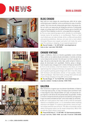 Aqui está um novo espaço de coworking que, além de ter salas confortáveis para trabalhar como se estivesse em casa, é multifacetado. Tem uma zona de restauração para fazer uma pausa, beber um café e ver exposições de fotografia e pintura. E ainda pode alugar um antigo quarto de Fernando Pessoa, que se mantêm tal como foi! Para trabalhar ou dormir, uma experiência inspirada! 3 This is a new coworking space which, besides its comfortable, homely rooms for working in, is multifaceted. There’s a food court where you can take a break, drink a coffee and see photo and painting exhibitions. And you can even rent a room where Fernando Pessoa once stayed, and which still looks the same way! For working or sleeping, it’s an inspired experience! 4D Rua da Trindade, 1 · Tel. 309 742 540 · www.blogchiado.net todos os dias / open daily 9h00-20h00