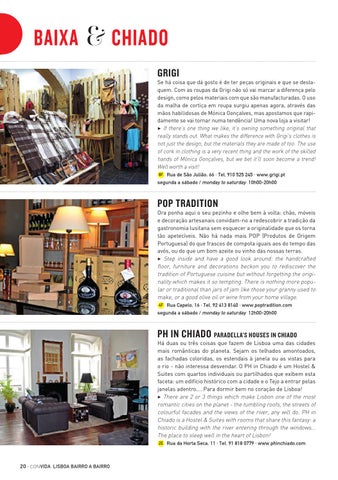 Ora ponha aqui o seu pezinho e olhe bem à volta: chão, móveis e decoração artesanais convidam-no a redescobrir a tradição da gastronomia lusitana sem esquecer a originalidade que os torna tão apetecíveis. Não há nada mais POP (Produtos de Origem Portuguesa) do que frascos de compota iguais aos do tempo das avós, ou do que um bom azeite ou vinho das nossas terras. 3 Step inside and have a good look around: the handcrafted floor, furniture and decorations beckon you to rediscover the tradition of Portuguese cuisine but without forgetting the originality which makes it so tempting. There is nothing more popular or traditional than jars of jam like those your granny used to make, or a good olive oil or wine from your home village. 4F Rua Capelo, 16 · Tel. 92 413 8140 · www.poptradition.com segunda a sábado / monday to saturday 12h00-20h00